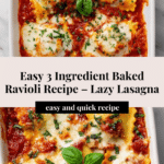 This easy 3 Ingredient Baked Ravioli, also known as Lazy Lasagna, is a simple and delicious meal perfect for busy weeknights. It features frozen cheese ravioli baked with rich pasta sauce and plenty of melted mozzarella cheese, creating a comforting, cheesy dish that the whole family will love.