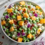 Keywords: pea salad, Easter salad, creamy pea salad, bacon salad, spring side dish, potluck salad, quick salad, easy pea salad, cheddar cheese salad