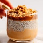 - Assemble the pudding: Divide the chilled chia pudding evenly into 3 jars or serving bowls. Top with the stewed apples, then sprinkle with the prepared oat and nut crumble (about 2 tablespoons per jar). Optionally, add a spoonful of extra apple butter and a drizzle of maple syrup before serving for extra sweetness and flavor.
