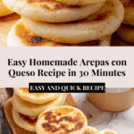Arepas con Queso are a delicious and comforting Venezuelan snack made from cornmeal and stuffed with melty mozzarella cheese. Crispy on the outside and soft on the inside, these cheesy arepas make a perfect treat for any time of day.