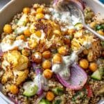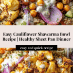 This Cauliflower Shawarma Bowl is an easy and flavorful sheet pan dinner featuring spiced roasted cauliflower, chickpeas, and red onions served over quinoa with a creamy yogurt sauce. Packed with Middle Eastern-inspired spices like paprika, cumin, and cinnamon, this vibrant, wholesome bowl is perfect for a quick weeknight meal that’s healthy and satisfying.