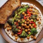 A vibrant and flavorful vegan dish featuring charred broccoli and za’atar-spiced chickpeas accompanied by a tangy, garlicky vegan yogurt sauce. Quick to prepare and full of Middle Eastern-inspired flavors, this recipe is perfect for a healthy and satisfying meal.
