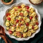 This Cheese Tortellini with Summer Veggies recipe combines delicious three cheese tortellini with vibrant fresh summer vegetables sautéed in olive oil and tossed in a savory marinara sauce. Enhanced with garlic, fresh herbs, and Parmesan cheese, this quick and easy 30-minute meal is perfect for a flavorful and colorful weeknight dinner that serves six.