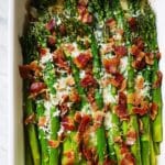 Cheesy Baked Asparagus with Gruyere, garlic, and bacon is a delicious and easy side dish that combines tender asparagus with savory flavors. It’s perfect for a weeknight dinner or a special occasion and guaranteed to please cheese and bacon lovers alike.