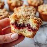 - Top with Crumble: Sprinkle the remaining crumbly dough over the jam in each muffin well, covering it evenly to create the crumble effect.