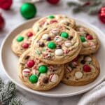 Keywords: Christmas cookies, holiday cookies, kitchen sink cookies, festive cookies, M&M cookies, white chocolate cookies, salty sweet cookies, easy cookie recipe