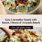 A quick and flavorful cucumber snack topped with cheddar cheese, bacon bits, and a zesty avocado lime ranch dressing. Perfect for a light, refreshing bite with crunchy nuts or seeds and fresh herbs for added texture and taste.