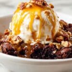 - Serve: Once cooked, scoop out portions of the cake. Serve warm topped with a scoop of vanilla ice cream, extra chopped pecans, and a drizzle of caramel sauce for added indulgence.
