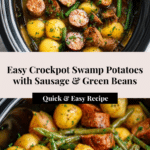 Keywords: Crockpot swamp potatoes, slow cooker potatoes, andouille sausage recipe, easy comfort food, one-pot meal, green beans and potatoes, buttery slow cooker dish