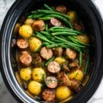 - Combine Ingredients: Toss the sliced sausage, sliced onion, halved baby potatoes, trimmed green beans, and minced garlic directly into your slow cooker.