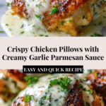 These decadent chicken pillows feature tender, juicy chicken breasts wrapped in flaky crescent dough and topped with a rich garlic Parmesan sauce. This comforting dish comes together quickly and is perfect for a crowd-pleasing dinner in just 35 minutes.