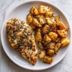 - Prep the Potatoes: Cut potatoes into even-sized chunks for uniform roasting. Toss them with olive oil, salt, pepper, and dried oregano to match the chicken’s seasoning.