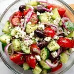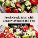 A vibrant and refreshing Greek Salad with creamy avocado and tangy feta cheese, tossed in a flavorful homemade red wine vinaigrette. This easy 20-minute recipe combines fresh cucumbers, tomatoes, kalamata olives, red onions, and herbs, making it a perfect healthy appetizer or side dish for any Mediterranean-inspired meal.