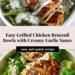Keywords: grilled chicken bowls, broccoli bowls, creamy garlic sauce, healthy dinner, weeknight meal, bowl meal, grilled chicken recipe, roasted broccoli, Greek yogurt sauce