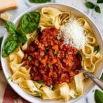 This classic Bolognese sauce recipe delivers a rich, hearty meat sauce simmered to perfection with aromatic vegetables, Italian sausage, ground beef, and a blend of herbs and spices. Simmered slowly to develop deep flavors, it is perfect served over tagliatelle or pappardelle pasta and garnished with freshly grated Parmesan cheese and fresh herbs.