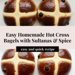 These Hot Cross Bagels are a delightful twist on traditional hot cross buns, combining warm spices, sultanas, and a tangy Greek yoghurt dough. Perfectly hand-shaped and adorned with a signature flour cross, these bagels are baked until golden and finished with a sweet honey or maple syrup glaze for a deliciously soft and flavorful treat that’s perfect for breakfast or afternoon snack.