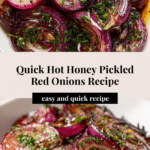 Keywords: pickled red onions, hot honey, spicy pickled onions, quick pickles, condiment recipe, tangy onions