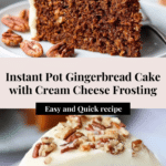Keywords: Instant Pot gingerbread cake, holiday cake, molasses cake, pressure cooker cake, cream cheese frosting, spiced cake recipe