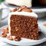 - Frost the cake: Spread the frosting evenly over the cooled cake and immediately sprinkle the chopped pecans on top for garnish.