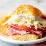 These Italian Sliders are a delicious and easy-to-make crowd favorite featuring Hawaiian rolls loaded with a mix of Italian meats, melty cheeses, and a fresh, tangy grinder salad. The sandwich buns are brushed with a flavorful buttery herb sauce and baked to perfection, making them perfect for gatherings or a hearty meal.