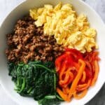 Keywords: Keto breakfast, low carb breakfast, breakfast bowl, meal prep, scrambled eggs, sausage, sautéed greens, bell peppers, ketogenic recipe