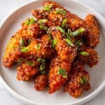 This Korean Chicken recipe features crispy deep-fried chicken strips marinated in buttermilk and coated with a flavorful spicy and savory flour mix. Tossed in a sticky, sweet, and spicy gochujang-based sauce, the chicken is garnished with fresh spring onions, sesame seeds, and chili flakes, delivering a delicious balance of heat and sweetness in every bite.
