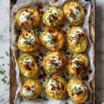 - Garnish and Serve: Remove from oven and top each potato with a dollop of sour cream, a sprinkle of chopped green onions, and an extra pinch of flaky salt for added flavor. Serve warm and enjoy your loaded baked potato bites!