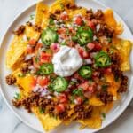 Keywords: loaded nachos, beef nachos, cheese nachos, taco seasoning, party appetizer, Mexican snack, baked nachos