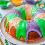 Keywords: Mardi Gras King Cake, King Cake, Mardi Gras dessert, cinnamon cake, braided cake, cream cheese glaze, festive cake