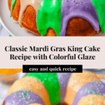 Celebrate Mardi Gras with this classic King Cake recipe featuring a soft, cinnamon-spiced dough braided into a ring, topped with a colorful cream cheese glaze in purple, green, and gold. Perfect for festive gatherings, this traditional cake offers a delightful balance of sweet, creamy, and spiced flavors.