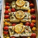 Keywords: Mediterranean baked fish, healthy fish recipe, baked white fish, pescetarian dinner, quick fish recipe, cod baked with vegetables, lemon fish recipe