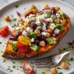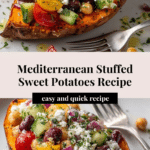 Keywords: Mediterranean stuffed sweet potatoes, baked sweet potatoes, healthy vegetarian dinner, chickpea stuffed sweet potatoes, easy Mediterranean recipes