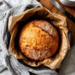 - Bake Covered: Carefully lift the parchment paper with the dough and place it into the preheated pot. Cover with the lid and bake for 30 minutes to trap steam for a crispy crust.
