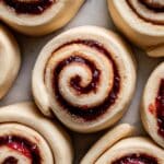 - Add Filling: Spread the peanut butter evenly over the dough almost to the edges. Drop dollops of jelly over the peanut butter and gently swirl/spread to combine as best as possible.
