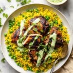 Peruvian Chicken and Rice with Green Sauce is a flavorful, complete meal featuring marinated chicken grilled or baked to juicy perfection. Served over seasoned Peruvian yellow rice and topped with a creamy, zesty green sauce, this dish is sure to impress your family and friends.