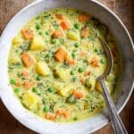 - Simmer the Soup: Add the diced potatoes and frozen green peas to the pot, then pour in the chicken broth. Increase the heat to high and bring the mixture to a boil. Once boiling, cover the pot and reduce the heat to low, allowing the soup to simmer gently for 15 minutes until the potatoes are tender.