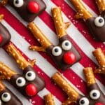 Keywords: reindeer pretzels, holiday treats, Christmas snacks, chocolate dipped pretzels, festive treats, easy holiday recipes