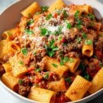 This classic Rigatoni Bolognese recipe features tender rigatoni pasta tossed in a rich, savory meat sauce made with ground beef, aromatic vegetables, tomatoes, and optional red wine and milk for extra depth and creaminess. Perfect for a comforting Italian dinner, it’s garnished with fresh parsley and Parmesan cheese for a flavorful finish.