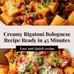 Keywords: Rigatoni Bolognese, Italian pasta recipe, meat sauce, classic Bolognese, rigatoni pasta, easy Italian dinner