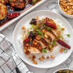This Sheet Pan Kung Pao Pork Chops recipe is a quick and flavorful dinner solution that combines tender pork chops with a spicy, tangy, and slightly sweet Kung Pao sauce. Baked entirely on a sheet pan for easy cleanup, it features classic Chinese-inspired flavors including soy sauce, garlic, ginger, dried chilies, and roasted peanuts. Served over fluffy white rice and garnished with fresh green onions, this dish offers a perfect balance of texture and heat in under 30 minutes.