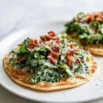 - Add Toppings: Once cooked, top each tortilla with chopped romaine lettuce, a drizzle of Caesar dressing, a sprinkle of grated Parmesan cheese, and crispy bacon bits. Optionally, toss the romaine with the Caesar dressing beforehand for a dressed salad topping.