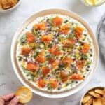 - Serve: Accompany the dip with lemon wedges, bagel crisps, and cucumber slices for guests to enjoy as dipping options, completing a delicious and visually appealing appetizer.