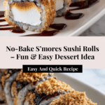 S’mores Sushi is a fun, no-bake dessert that creatively transforms the classic campfire s’mores into bite-sized sushi rolls. Made with a base of Rice Krispies cereal mixed with melted butter and mini marshmallows, then layered with marshmallow fluff, crushed graham crackers, and chocolate chips or Nutella, this treat offers all the beloved flavors of s’mores in a unique, playful presentation. Perfect for parties, family gatherings, or as an enjoyable DIY dessert activity, S’mores Sushi is quick to prepare and sure to delight both kids and adults alike.