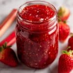 Keywords: Strawberry rhubarb jam, homemade jam recipe, fruit jam, stovetop jam, spring preserves