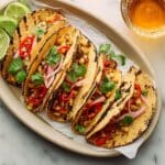 - Char tortillas: Char tortillas over a gas burner flame or heat in a cast iron skillet for 10-30 seconds per side until lightly charred. Stack tortillas and wrap in a dish towel to keep warm.