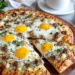 This breakfast pizza with sausage gravy is a hearty and delicious way to start your day. Combining a crispy crust with creamy sausage gravy, melted cheese, and perfectly cooked eggs, it brings all your favorite breakfast flavors together in one dish.