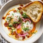 Turkish Eggs (Cilbir) is a vibrant and flavorful breakfast featuring creamy garlicky Greek yogurt topped with perfectly poached eggs, smoky bacon, and tangy pickled red onions. Enhanced with melted paprika butter and fresh herbs, this dish offers a delightful balance of textures and bold tastes in just 25 minutes.