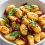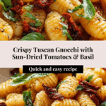 This Tuscan Gnocchi with Sun-Dried Tomatoes and Basil is a comforting Italian dish featuring tender homemade potato gnocchi tossed with fragrant sun-dried tomatoes, fresh basil, and garlic, pan-fried to golden perfection. The gnocchi have crispy edges while remaining soft inside, making it a rustic yet elegant meal perfect for a cozy dinner.