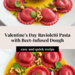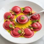 Celebrate Valentine’s Day with these beautiful floral-inspired ravioletti, featuring delicate handmade beet-dyed pasta filled with a creamy ricotta and goat cheese mixture, finished with a luscious walnut butter sauce and fresh herbs. This recipe combines artistry and flavor, perfect for a romantic occasion or springtime gathering.