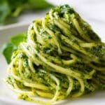 - Combine pasta and sauce: Pour the blended green sauce back into the skillet and warm over medium heat. Add the cooked spaghetti and toss well to coat the pasta evenly with the sauce. Heat for 1-2 minutes until warmed through.